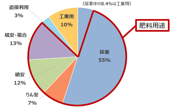 生産されたアンモニアの9割は生産国内で消費されます。上位生産国はいずれも人口が多い農業大国であり、ほとんどが農業用の化学肥料の原料となっています。