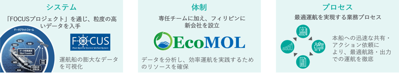 効率オペレーション=DarWINプロジェクトは、さらに3つの2次支流へと遡る。①運航船の膨大なデータを可視化する「システム」、②データを分析して効率運航を実践するためのリソースを確保する「体制」、③本船への迅速な共有やアクション依頼によって最適航路や出力での運航を徹底する「プロセス」、だ。今回紹介する「FOCUSプロジェクト」は、①のシステムの領域を担うものとなる。