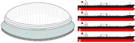 もちろん船によってタンクの大きさは異なりますが、最近建造された多くのVLCCは約200万バレルの原油を積み込むことが出来る設計になっています。東京ドームの容積が780万バレル(124万立方メートル)ですので、VLCCに積まれた原油4隻分で東京ドームがいっぱいになります。原油の比重は産地によって様々ですが、200万バレルの原油は重量にすると約30万トンです。