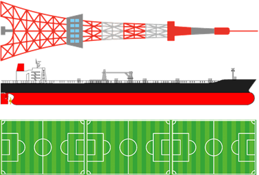 VLCCの一般的な全長は約330mで東京タワーや東京駅とほぼ同じ、船体の幅は約60mで甲板の大きさはサッカーフィールドを縦に3面並べた大きさとほぼ同じです。船の底からマストの先端までは約65m(18階建てビルに相当)、また、貨物を満載した時の喫水(水面から船底までの深さ)は20mを超えます。